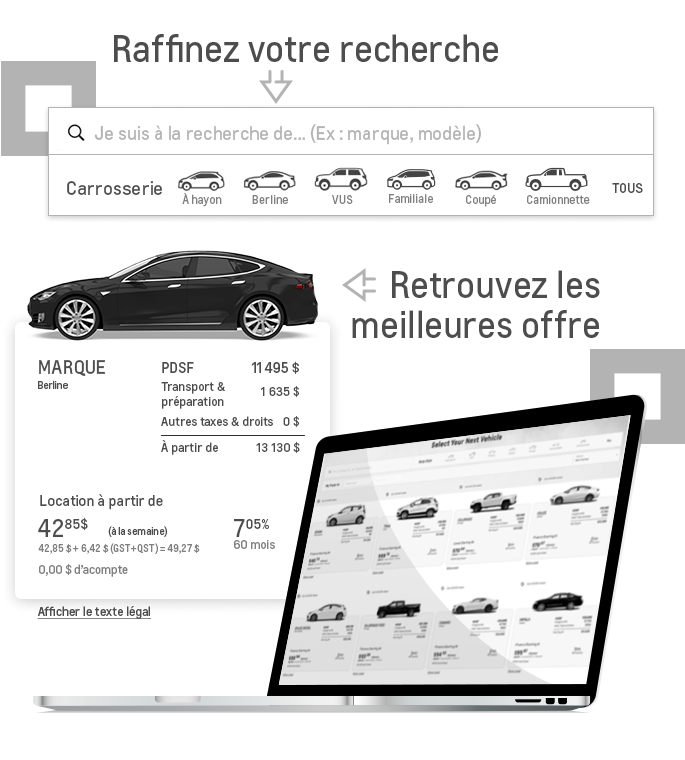 Choisissez le plan de financement ou de location qui convient le mieux à votre situation dans le confort de votre maison. Nous avons une gamme d'options flexibles et adaptées à toutes les situations financières.